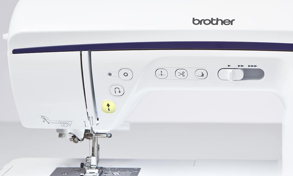 Fonctions assistées : Touches coupe-fil automatique, point d’arrêt/renfort, et position d’arrêt de l’aiguille (haut/bas).